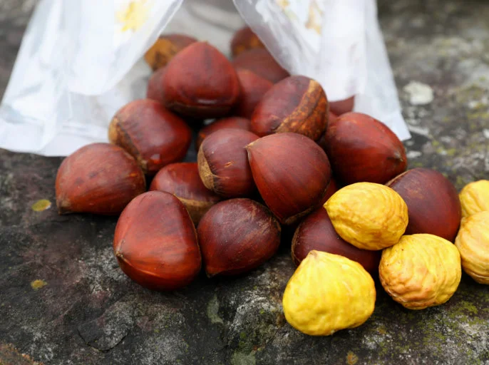 Both are valued for their health benefits: pine mushrooms are believed to boost immunity, while chestnuts provide vitamin C and fiber.