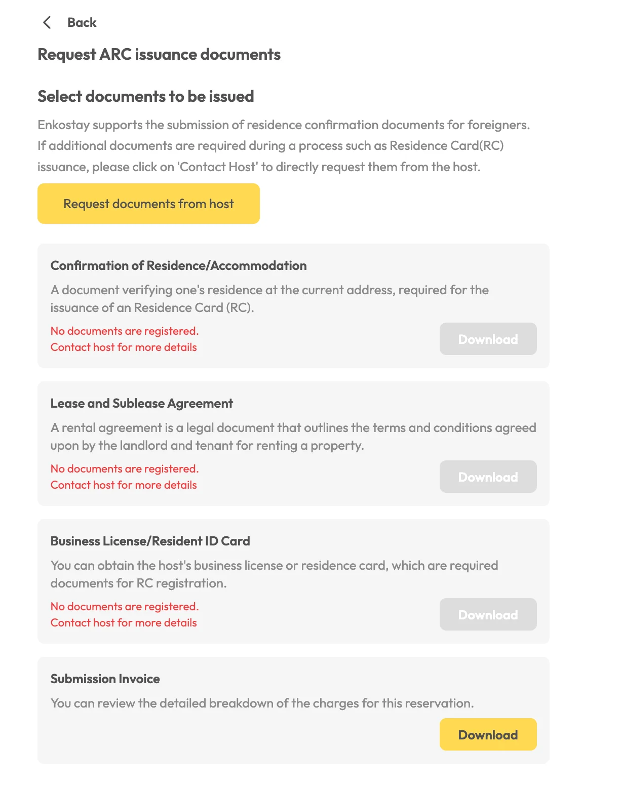 If not, click Request documents from host to send a notification to your host.