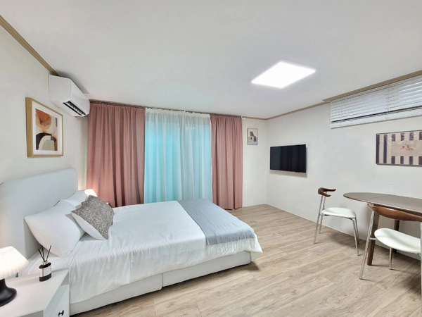 It is a private studio located about a 4-minute walk from Gongdeok Station. There is a queen-sized bed, so up to two people can stay for a medium and long time. This room is a studio with individual kitchens, Simple cooking is possible in the room. It is equipped with a TV and individual refrigerator, Air conditioning and individual heating are installed for comfortable use throughout the year. Public washing machines and dryers are provided in the building, Public facilities are available free of charge. It is a convenient location to move to major areas such as Gongdeok, Mapo, Seoul Station, and Yeouido. • This accommodation can be used for up to two people. • Visitors and additional people are not allowed to stay. • Please take off your shoes and use them inside the accommodation to keep the room clean. • Your pets are not allowed to enter. • Indoor smoking is strictly prohibited. • Please consider other residents when using public spaces. • Please pay attention to the noise at night. • The inflow of pests due to building structure and seasonal and environmental factors is not a reason for refund. • It is located about a 4-minute walk from Gongdeok Station. • When using the subway, it is convenient to move to major areas such as Seoul Station, Hongdae, and Yeouido. • Convenience stores, cafes, and restaurants are located near the accommodation, making life convenient.