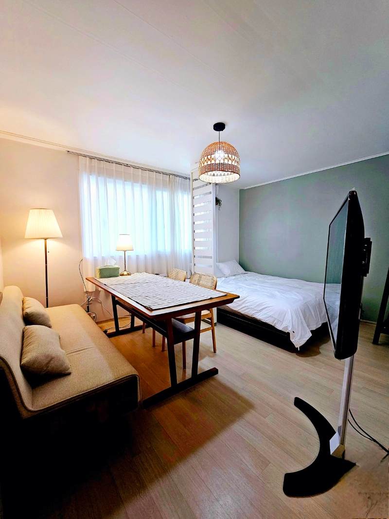 🙂 1. Various bedrooms – Single room, double room, and triple room for up to 6 people. 2. Hotel-style bedding & cleanliness priority operation – providing cleanly maintained beds and bedding every day. 3. Excellent location - Achasan Station 5 minutes walk, Children's Grand Park and Universal Arts Center walk. 4. Cozy and affordable amenities – complete with a dining and bedroom, kitchen and laundry room, suitable for both short and long stays.