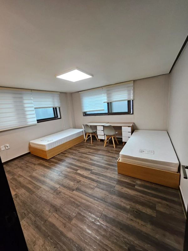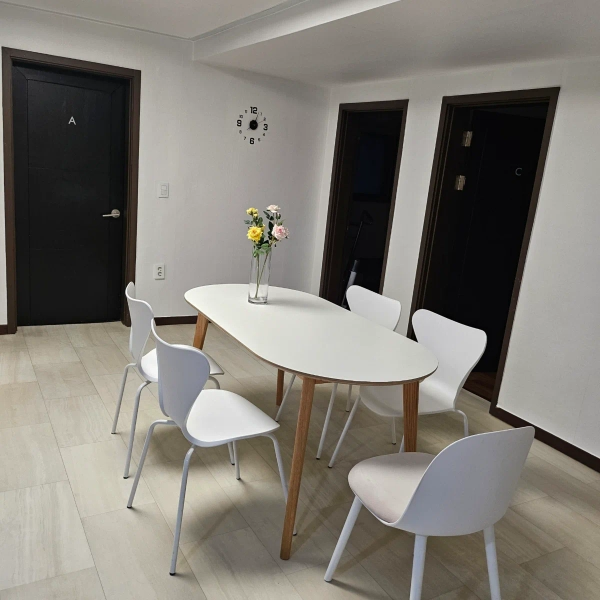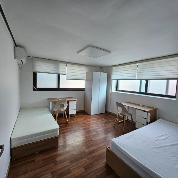 - It is a modern interior with a clean white tone. - It's a room with both a bed and furniture. - Public kitchens and bathrooms are kept clean and have good access to nearby amenities, making them suitable for both living and traveling. - It's a 1-minute distance from Soongsil University Entrance Station, and transportation is convenient.