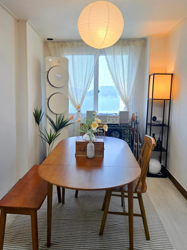On the hill of the White Yeoul Culture Village in Yeongdo, Busan, it is Yeoul Sound, where the sound of small waves and wind permeate. This isn't just an accommodation, it's a comma-like house of a day where your mind rests for a while every time you stay. As I sit by the window and look at the sea, I hear a story of waves and winds. With warm wood furniture and hanok sensitivity, we prepared it for a quiet but warm time. Sun-infused living room, cozy bedding bedroom, even small details... I hope your day here will be remembered for a long time. A trip alone, a break for two, and a precious day with your family. Even small trips with friends.- Slowly pass your time away from the sound of the brook. Near Busan tourist attraction ❗️ Taejongdae / Songdo Beach / Gamcheon Culture Village / Nampo-dong / International Market, etc Ocean View Brunch Cafe is a minute's walk away ★★You can use the bus stop 1 minute away★★ ⚠️ Please feel free to contact me if you have any questions! - Our accommodation is about 19 pyeong of apartment structure. 3 rooms, 1 king, 1 queen, and 1 small room It is also suitable for two or more people to live and can be used for up to six people. ★ In case of unavoidable circumstances, up to 8 people can use it. If you use it for more than six people, we provide a queen-sized topper and bedding, and we give you the rest of the small room as a bedroom. (If you want to use it, please contact us.) - It is located on the first floor of the ground and has less than five stairs, making it convenient for children, the elderly, and others. - It has two doors, but I'm using the front door on the first floor for privacy and convenience! (In case of rain, the front door of the apartment can be opened) - We have a washing machine and a dryer. There is also a drying rack, and there is a small yard, so natural drying is possible. (Available for long stays) <3 bedrooms, dining room, bathroom, kitchen> Living Room - Air Conditioner, Beam Project, Table, Bluetooth Speaker (LP Available) Bedroom 1 - 1 king bed, 1 queen bed, windowed air conditioner, TV Bedroom 2 - 1 queen bed, circulator Bedroom 3 - Courtesy of Topper, Circulator Bathroom - shampoo, conditioner, body wash, hand wash, dryer, curling iron, towel provided Kitchen - Refrigerator, rice cooker, electric pot, gas stove, Nespresso butuo, tableware and basic seasoning, bottled water ★ Insect repellent, home keeper, first aid kit! ★ - No smoking / meat / fish cooking inside - CCTV is installed at the entrance for security reasons. If additional people are admitted without prior inquiry, they will be immediately discharged. - No smoking is allowed in the accommodation. - Due to the nature of the apartment, neighboring families are attached. Please refrain from using excessive noise and sound devices after 10 o'clock. - You are not allowed to enter pets. ★ Please turn off the lights, air conditioners, and heating devices when you check out and contact us! ★