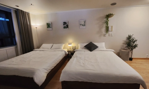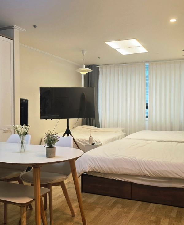 In the middle of a busy Hongdae area It's a quiet, neat space where you can catch your breath for a while. It's a large space. It is also a good space for several people, including three queen beds and a table. ❤️ How to use it : This space is operated in a non-face-to-face self-use manner. ❤️ Delivering notices and access information : After confirming the reservation, the rental notice and access password will be notified by message on the morning of the start of use. ❤️ Companion animals ×, smoking × (electronic cigarette ×) ❤️ Household goods guide (important) : This is a short-term rental space, and disposable items (towel, toothpaste, shampoo, etc.) are not provided. Please prepare your own personal household items. ❤️When making a reservation, 1. Purpose of visit, 2. Period of use, 3. Number of visitors, 4. Please send the following information through [chat inquiry]. ❤️If you have any questions, please ask me -> The sweet host will contact you quickly. -Connect to LG Felice building in the direction of Exit 9 of Hongik University Station on Subway Line 2 -Line 2, Gyeongui Central Line, and Airport Railroad Triple Station Area -A one-minute walk from the bus stop (airport bus)