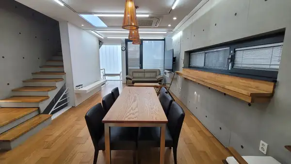 It is a two-story house located in Nampo-dong that uses clean 4th and 5th floors. The fourth floor has a living room, a laundry room, a kitchen, and a balcony overlooking Nampo-dong, while the fifth floor has a bedroom and bathroom rooftop space. The subway station is a 5-minute walk from the central station There is a bus stop right in front of the house, so transportation is convenient. The international market, piff square, Jagalchi market, and Yongdusan Park are next to each other Nearby universities include Dong-A University's Bumin Campus and Kosin University in nearby Yeongdo.