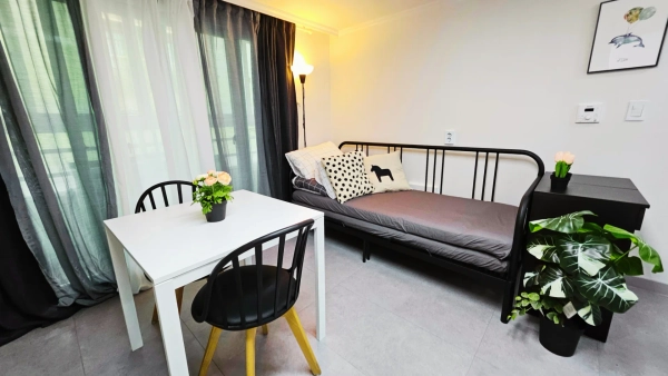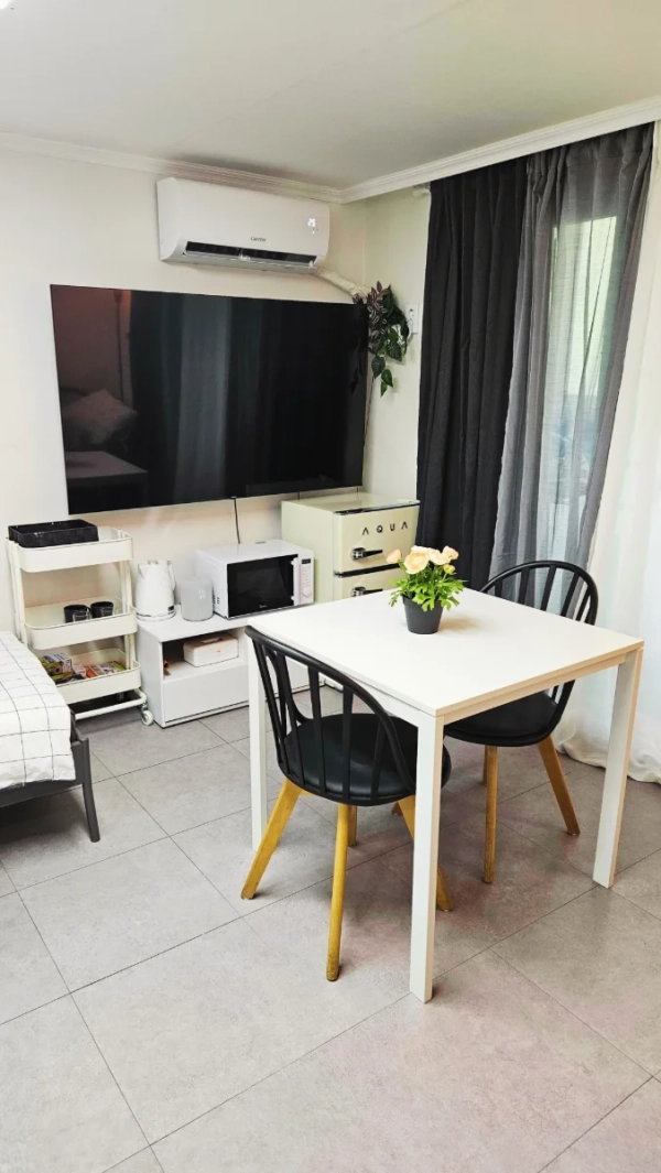Hello. This is a private accommodation located in the center of Hongik University, where you can enjoy the vibrant atmosphere of Hongik University in a comfortable and pleasant environment. It is a newly remodeled accommodation located in a convenient location within a two-minute walk from Hongik University Station. The accommodation is pleasant and clean, and it is a room with a single bed and sofa bed that can be used for up to three people. It comes with a 65-inch smart TV and free Wi-Fi for watching cable TV. Nearby, you can fully enjoy cafes, restaurants, shopping malls, various performances, and shopping with a minute's distance from convenience stores and a minute's distance from Hongik University's main street.