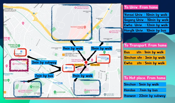Seeking last housemates in the vibrant Sinchon, Hongdae area. (FEMALE ONLY) from Nov 22nd Our 3-bedroom, 2-bath space is located in the heart of Hongdae, Sinchon, Ewha Women's Univ., Sogang Univ., Yonsei Univ., and Mapo District. ( 연세대, 서강대, 이화여대, 신촌, 홍대, 마포구 ) Common area : Water purifier, Air purifier, Cloth electric dryer, Washing machine. Each room has installed A.C We offer official rental documents recognized by the Immigration Office for foreigner registration. 1. Prioritized Safety: security with fingerprint locks to each room. 2. Harmonious Living: Our house rules foster respect and care among housemates. 3. Prime Location: Steps away from daily conveniences, top universities, and popular hotspots in Hongdae and Sinchon. - Nearby Facilities: E-mart (5-min walk), Cinema (2-min walk), and key public transport (1-4 min walk). - Universities: Yonsei, Sogang, Ewha (10-min walk), Hongik Univ (6-min by bus). - Hotspots: Sinchon street (5-min walk), Hongdae street (7-min by bus).