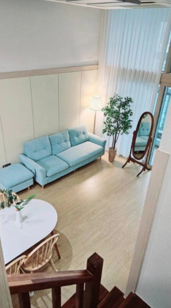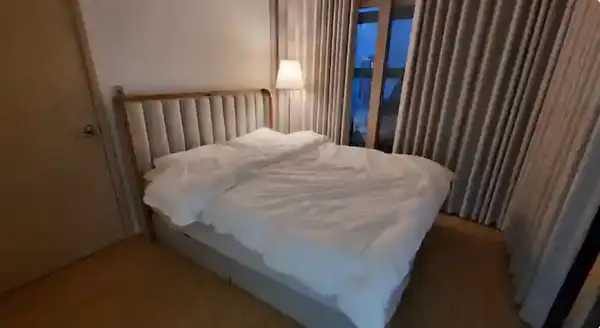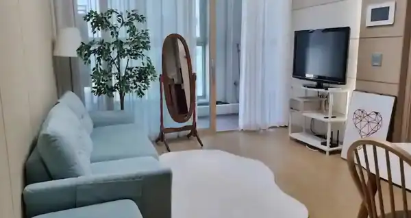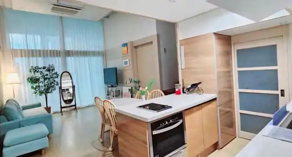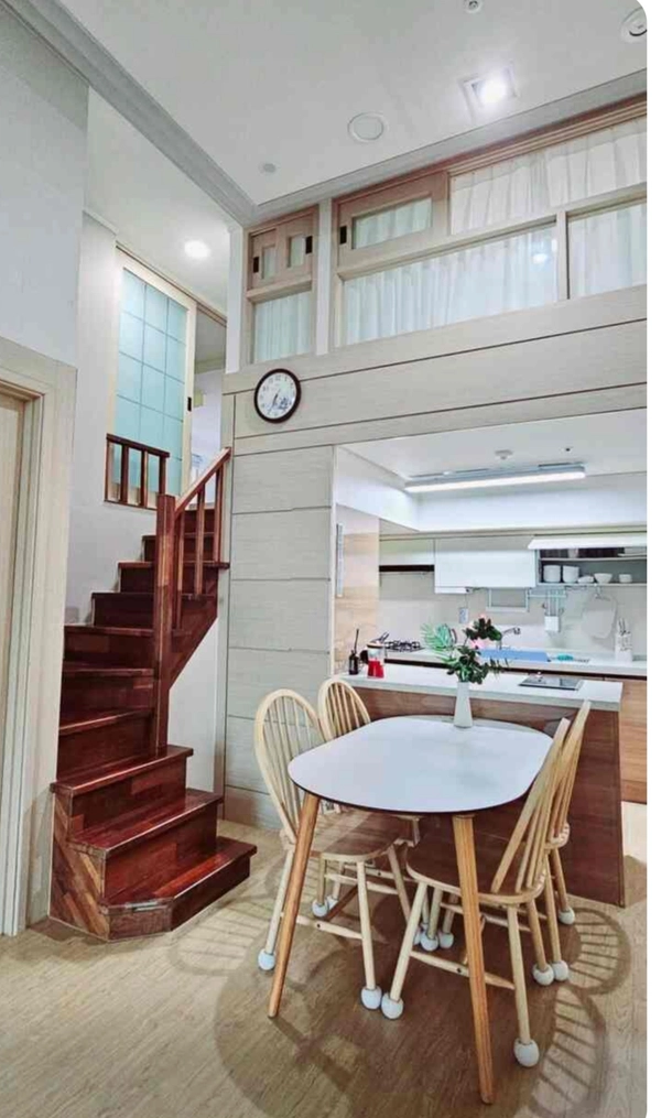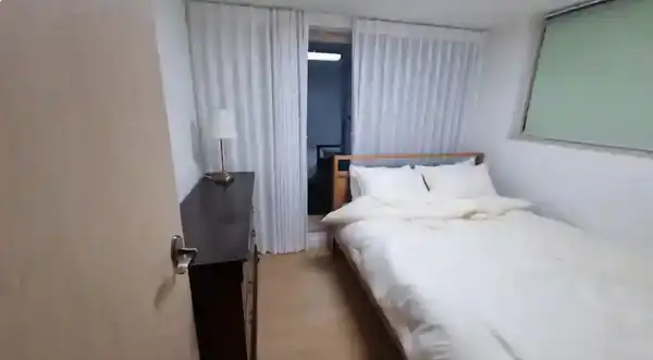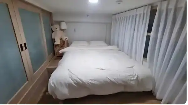 It's right in front of Haeundae Jungdong Station. It's a double-decker type, so the house is very efficient. The ocean view and the mountain view are so wonderful that the first floor is 4 meters high. The second floor has three beds, so it's easy to relax. There is an air conditioner only on the first floor, and the view is cool and open because it is high-rise. The double-decker is about 1.7 meters tall, but it's very comfortable to sleep in bed. It's cozy.
