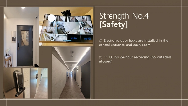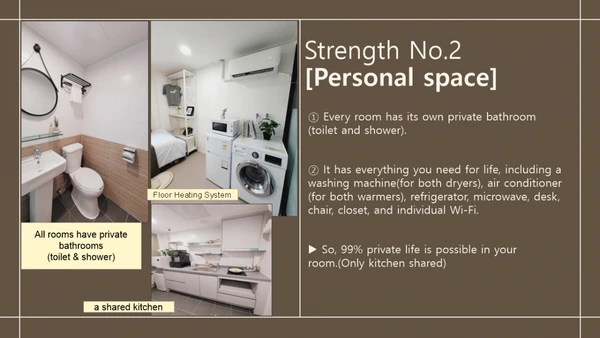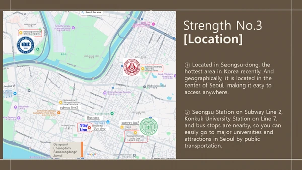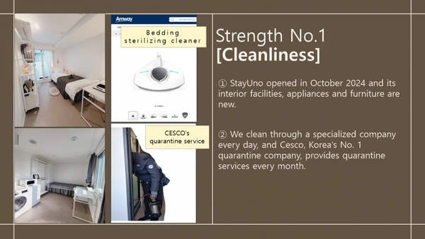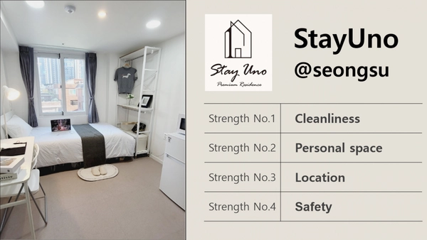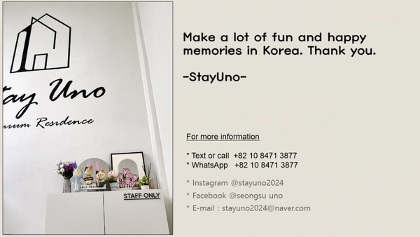 'Cleanliness' + 'Personal space' + 'Location' + 'Safety' = 'StayUno' Strength No1. [Cleanliness] ① StayUno opened in October 2024 and its interior facilities, appliances and furniture are new. ② We clean through a specialized company every day, and Cesco, Korea's No. 1 quarantine company, provides quarantine services every month. Strength No2. [Personal space] ① Every room has its own private bathroom (toilet and shower). ② It has everything you need for life, including a washing machine(for both dryer), air conditioner (for both heater), refrigerator, microwave, desk, chair, closet, and individual Wi-Fi. ▶ So, 99% private life is possible in your room.(Only kitchen shared) ** Residents Only. No Unauthorized Access Strength No3. [Location] ① Located in Seongsu-dong, the hottest area in Korea recently. And geographically, it is located in the center of Seoul, making it easy to access anywhere. ② Seongsu Station on Subway Line 2, Konkuk University Station on Line 7, and bus stops are nearby, so you can easily go to major universities and attractions in Seoul by public transportation. Strength No4. [Safety] ① Electronic door locks are installed in the central entrance and each room. ② 11 CCTVs 24-hour recording (no outsiders allowed) ============================================= ※ 8–9 minutes on foot from both Seongsu Station and Konkuk University Station. Located on Yeonmujang-gil. 1. How to get to major schools and areas To Hanyang University - Only 2 stops on subway line 2 or 5 stops by bus To Konkuk University - 2 stops by bus or About 15 minutes on foot. To Sejong University - 3 stops by bus To Cheongdam Station / Bongeunsa Station / Samseong-dong Coex - 3~5 stops by bus To Jamsil Lotte World Mall - 5 stops on subway line 2 To Gangnam Station - About 25 to 28 minutes by bus or subway. 2. Accommodation Details 1) Key conditions - Short-term stay available (1 month) - No additional costs other than the room rent fee - Monthly Rent : Rates range from KRW 780,000 to KRW 1,000,000 [★ Prepayment] ** No elevator 2) Private room - a spacious room & a wide bed - Large double pane window(noise completely shut off) - Private bathroom and shower room - Individual electronics : air conditioner & heater / LG Drum Washing Machine & dryer / microwave / double-door refrigerator - a high-end desk and hanger - Individual High Speed Internet - Soundproof wall construction (fireproof construction) which is the same as the studio - Double door lock (outdoor) - Monthly pest control service (Cesco) 3) Shared kitchen - Ice & water purifier - Coffee machine and coffee beans (Seongsu-dong famous cafe or Starbucks coffee beans) - Rice & rice cooker - 5~6 types of ramen - Food waste disposer - Cooking utensils and dishes, etc. - First aid kit ※ For inquiries or reservations, please use the following method at any time: - Text or call +82 10 8471 3877 - WhatsApp : +82 10 8471 3877 - E-mail : stayuno2024@naver.com Make a lot of fun and happy memories in Korea. Thank you.