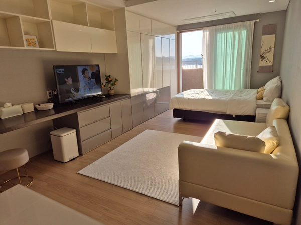 Quiet and peaceful, this unique space has the best sunset view of Seongsan Ilchulbong. Clean and private, you will make the best memories while watching the sunset and ocean view while enjoying the flowers blooming during peak seasons. Packed with amenities, such as tv, free wifi, air conditioning, full kitchen and washer. Also is pet friendly! there is free underground parking with no car registration needed. wifi info is on the blackbox behind the tv. please dont open the locker next to the window as its for cleaning staff only. netflix/tv Press External Input 1 or External Input 2 button on the tv remote control. Use the black Netflix remote control for Netflix and other tv remote for tv. make sure all device lights on are plugged in. please never change door lock number or we will have to charge you a fee to replace the lock itself. dont use the bathroom lock as it can get stuck sometimes. We are pet friendly and its a 5 year old building! There are various attractions nearby such as udo and seongsan ichilbong! We also offer shorter term stays. Message host for details!