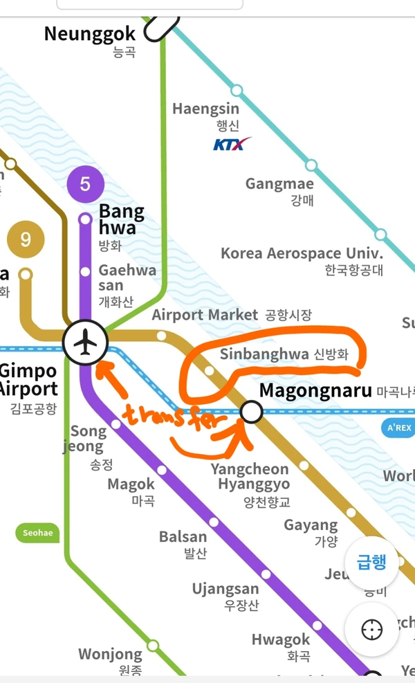 to the airbnb. : by taking the Airport train and transfer to line 9 to Shinbangwha station, 2 minutes on foot to the stay. Which station : Shinbangwha station line 9. easiest way to access from Incheon airport. : take the Airport train to Gimpo Airport, transfer to line 9, Shinbangwha station by all stop train, not express train. 30 minutes to Hongdae 1 hour to Gangnam. 50 minutes to Myeongdong