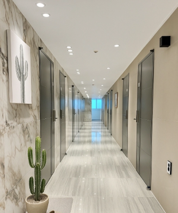 Clean and bright new facility, just 30 seconds before the subway No noise for non-smoking outsiders There are a lot of people around because of the grocery shopping on the weekend. This is fun.