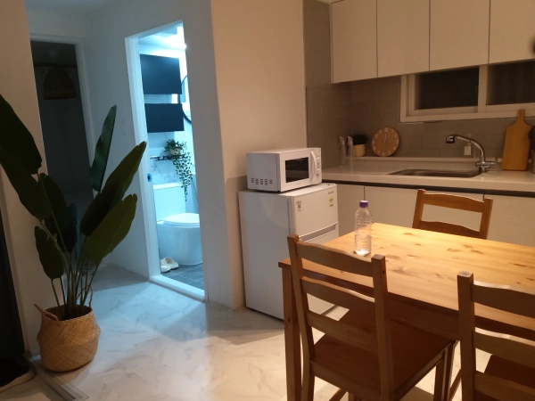 Cozy 2-room apartment in Ilsan Dong-gu, perfect for long-term stays. Ideal for international students, medical visitors, and professionals. Equipped with Wi-Fi, refrigerator, microwave, stove, washing machine, air conditioning, and heating. Bedding is not provided, but a local purchase guide is available. English guidance and a welcome gift included for a comfortable stay. *No pets allowed. *No smoking indoors (violation may result in deduction from the cleaning/damage fee). *Handle furniture, appliances, and fixtures with care. *Keep noise to a minimum, especially at night (violation may result in deduction from the cleaning/damage fee). *Overnight stays for unregistered visitors are prohibited. *Visitors are allowed only until 10 PM. Soundproofing is generally good. 2-floor small multi-unit residential building with no elevator. Bus stops within a 5-minute walk; Pungsan Station about 15–18 minutes on foot (1 km). *Close to Dongguk University Bio Campus, Oriental Medicine Hospital, and Cancer Hospital. *Supermarkets, Anygol food street, convenience stores, and cafes nearby. *Jeongbalsan Park and KINTEX accessible within 5–10 minutes by car. Map apps (Google Maps/Naver Maps) recommended for exact routes.