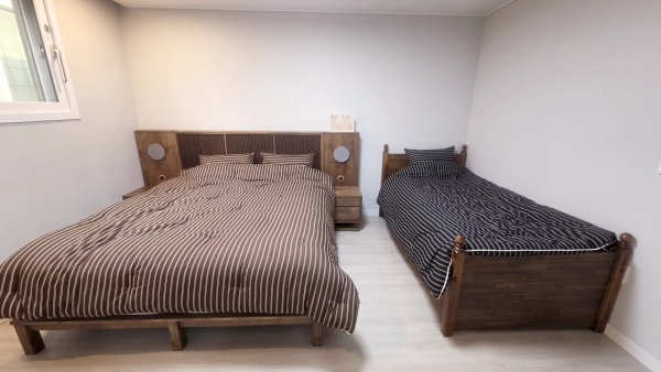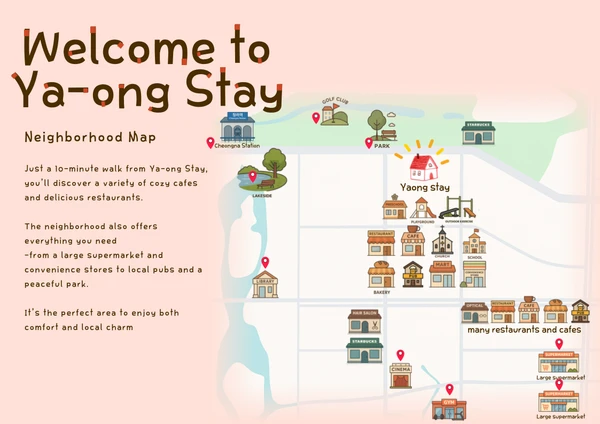 ✨ 暖かいモダンハウス、仁川空港近くの家族·団体宿泊施設 🏡宿泊施設の紹介| Description ヤオンステイ(Ya-ong Stay)は156.61㎡(約47坪)の広い単独プライベートハウスです 仁川空港と青羅国際都市の近くに位置しています。 1階は広々としたリビングルーム、キッチン、食事スペース、 2階は寝室3つとバスルーム3つで完全に分離されています 家族、友人、団体旅行者、長期滞在者のすべてが快適に滞在できます。 すべての寝室にはホテル級のプレミアムマットレスが備え付けられています 旅の疲れを深く癒す最高の休息を提供します。 📘宿泊先マニュアル | House Manual ✔韓国語及びEnglish宿泊マニュアル提供 ✔チェックイン·チェックアウトのご案内 ✔家電製品の使い方とWi-Fiのご案内 ✔ゴミの分別·出し方について 🔒安全·セキュリティ|Safety & Security ▫宿泊期間中のみ使用可能な仮パスワードを提供 ▫非対面チェックインと防犯のための宿泊施設外部CCTV設置 ▫リクエストに応じてすべての客室に個別鍵を提供可能 ▫予約人数以外の外部からの訪問客は絶対不可 🏡宿の構成 ✔寝室3つ ✔バスルーム3つ ✔広々としたリビング ✔キッチン及び食事スペース ✔屋上利用可能 🛌ベッド構成 ▫ ラージキング 1個 ▫ スーパーシングル6個 ▫ 8人以上の場合、床用マットレスや寝具提供 ▫リクエストの際、追加のスーパーシングルベッド1台+ベビーベッドの提供可能 🧺 便益施設 ✔洗濯機、乾燥機、洗剤、柔軟剤 ✔大型冷蔵庫 ✔ 電子レンジ、IHクッキングヒーター、エアフライヤー ✔ コーヒーマシン、電気ケトル ✔食器及び調理器具 ✔ ワイングラス、ワインオープナー ✔大型TV ✔ソファ、ソファテーブル ✔分別箱·乾燥台·掃除道具·真空掃除機 ✔禁煙宿 ✔ 無料駐車 家の前駐車場最大3台、家の周辺駐車場可能、徒歩5分公園駐車場利用可能(無料) 🐱 客室別の特徴 🛌 ROOM1 ▫ ラージキングベッド 1台 ▫ 部屋専用バスルーム ▫ ドレスルーム ▫ 個別冷暖房 ▫ ドレッサー、ヘアドライヤー ▫ 遮光カーテン、換気可能窓 🛌 ROOM2 ▫ スーパーシングルベッド 2台 ▫ 個別冷暖房 ▫ 広い窓と遮光カーテン 🛌 ROOM3 ▫ スーパーシングルベッド 2台 ▫ 明るい自然光が入る構造です ▫ 個別冷暖房 🍽スペース案内 🤍 居室 ▫ 大型テレビ ▫ ソファー、テーブル ▫ ホワイトウッドトーン 暖かいインテリアです 🍳キッチン ▫ 大型冷蔵庫 ▫ 電子レンジ、IH調理器、エアフライヤー ▫ 多彩な調理器具·食器類 ▫ コーヒーマシン、電気ケトル ▫ ワイングラス、オープナー ▫ 六人掛け食卓 ▫簡単な料理が可能 🛁バスルーム ▫ タオル ▫シャンプー、コンディショナー、ボディソープ、ハンドウォッシュ ▫ 歯磨き粉、ティッシュペーパー 📺エンタメ ▫ スマートテレビ ▫ ネットフリックス、ティービング、ディズニープラス、ユーチューブ、アップルテレビ、クーパンプレイが利用可能(一部は個人アカウントが必要) 📍位置案内 車で7分 → チョンラ国際都市駅 車で5分→コストコ 車で6分→仁川アジアードメインスタジアム(公演会場) 車で7分→ベアーズベストチョンラGC 車で9分→仁川国際CC 車で17分→ドリームパークCC 車で20分 → 仁川空港(地下鉄4駅) 車で30分 → 弘大(地下鉄6駅) 車で40分 → ソウル駅(地下鉄8駅) カフェ、レストラン、コンビニ、散歩道すべて徒歩5分以内 ✔️公演もゴルフも楽しめる最適なロケーション! ✔️仁川アシアード主競技場(公演場)と3ヶ所のゴルフ場が近く、余暇と休息を同時に楽しむことができます。 ✔️カフェ·コンビニ·食堂 徒歩5分 🎵公演とゴルフの両方を楽しむのに最適なロケーションです。 💡こんな方におすすめ ▫家族旅行 ▫ 友人又は団体旅行 ▫ 長期出張、ワケーション ▫ 1か月滞在 ▫ 公演·コンサート来場者 ▫ ゴルフ ラウンディング 目的 旅行客 📌宿泊施設利用時の注意事項 以下の内容を十分にお読みいただき、宿泊予約時に同意したものとみなされます。 🚭禁煙について 室内喫煙は絶対不可(電子タバコ含む) 室内でタバコの吸殻が発見された場合、罰金10万ウォンが請求されます 👟 室内靴 着用禁止 室内では靴を脱いで入室します 備え付けの上履きをご利用くださいませ 🔊騒音案内 静かな住宅街に位置する宿です 夜10時以降は特に騒音を減らし、パーティー目的のご利用は不可となります パーティールームではありません(パーティー及び高声、放歌、または喧騒な行為は不可) 🍳炊事関連 匂いが強く染み込む食べ物(肉·魚·魚介類など)の調理は控えていただきます ♻ゴミ分別 宿泊施設の案内に従ってごみとリサイクル品を分別して出してくれます 🌡冷暖房·電気使用 外出時、冷暖房機、照明など、必ず電源を切ります 故意に電気、水道、冷暖房を過度に使用し、経済的被害が発生した場合、追加料金を請求することがあります 🐶ペット ペット同伴は不可となります 🛠 施設物 破損 及び 紛失 施設物の紛失及び毀損時、購買価格を基準に賠償金が請求されることがあります 🔥 火災予防 