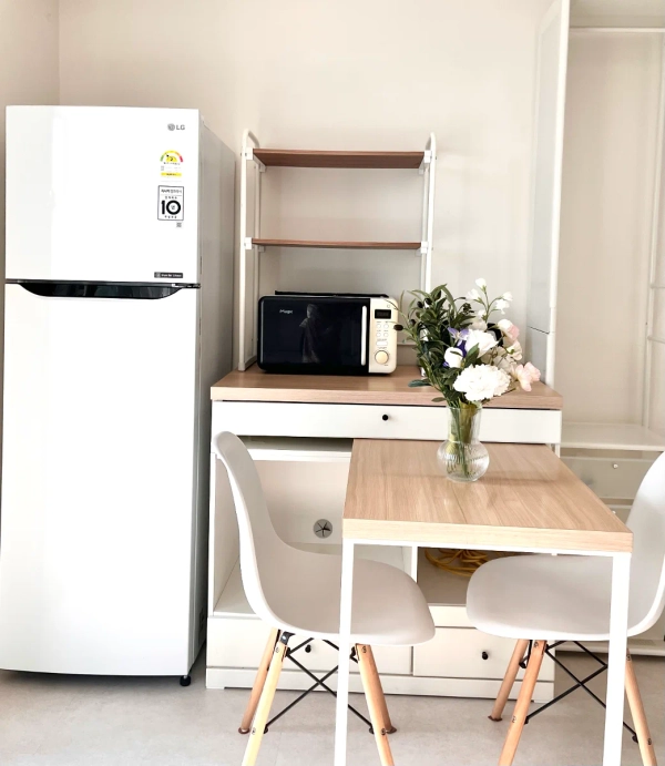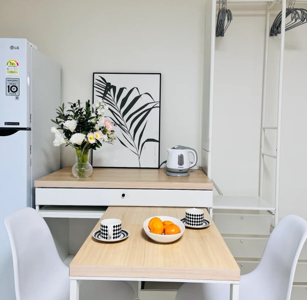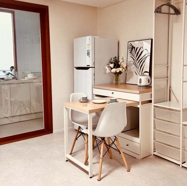 アパートの一世帯を独立したワンルーム形式で分けた居住空間で 玄関、浴室、キッチンはすべて分かれており、単独でご利用いただけます。 最近リフォームを終えたばかりで、床・キッチン・浴室などすべてが清潔で管理状態が非常に良好です。 約6坪前後の専用ワンルームでございます、 一人暮らしや短期・中期滞在に適した空間です。 ベッド、ダイニングテーブル、冷蔵庫、洗濯機、63インチスマートテレビ、ドレッサー、全身鏡、食器、調理器具など 生活に必要な家具と家電がすべて揃っています。 19階の高層階で、採光が良く静かで整った雰囲気の住環境を提供いたします。 週単位の契約が可能です (1日単位でお問い合わせ可能です) チェックイン:午後3時以降 チェックアウト:午前11時 (日程調整が必要な場合は事前にお問い合わせください) 管理費別途 室内禁煙 ペット同伴不可 本スペースは宿泊施設ではなく、短期賃貸の居住スペースでございます、 静かにご利用くださいますようお願いいたします。 大規模なマンションで、周辺にはスーパー、レストラン、カフェなど生活利便施設が充実しております。 7号線サガジョン駅から15分、5号線チャンハンピョン駅から15分、1号線フェギ駅から15分、チョンニャンニ駅から15分の距離です。 すべて自宅前のバス停から各駅行きのバスに乗ることができます。