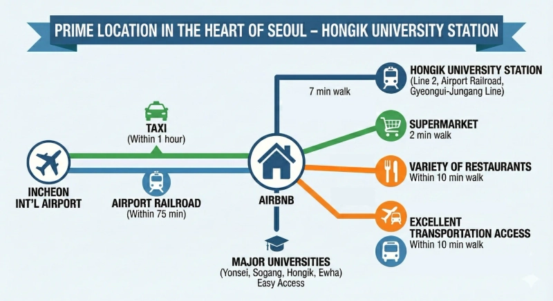 快適で便利なソウル滞在です。 必要不可欠な機能をすべて備えているため、お手頃な価格で活気のある場所に滞在できます。 【所在地】 賑やかな弘大にある弘益大学地下鉄駅まで徒歩5~7分です。 緑豊かな散策路である京義線の森公園から5分の距離にあります。 【交通】 弘益大学駅は地下鉄2号線、AREX、京義中央線と連結され、ソウルの名所や空港へのアクセスが容易です。 【宿泊施設】 ユニット全体: スペースは完全にプライベートなので、ゲストはエリアを共有することなく宿泊施設に完全にアクセスできます。 *キチネット: 基本的な調理器具、コンロ、冷蔵庫、電気ケトルなどがあり、簡単な食事を用意できます。 *Wi-Fi: 高速 5G Wi-Fi は、作業、ストリーミング、または接続状態の維持に使用できます。 *ストレージ: 手荷物や私物のための広いクローゼットや収納スペースが用意されています。 *暖房·空調: 冬でも暖かく過ごせる床暖房(オンドル)と涼しい夏のためのエアコンが特徴です。 *プライベートバスルーム: プライベートバスルームの利便性をお楽しみいただけます。 *バルコニー: 居心地の良いバルコニーは自然光をもたらし、新鮮な空気を楽しみリラックスするのに最適な場所を提供します。