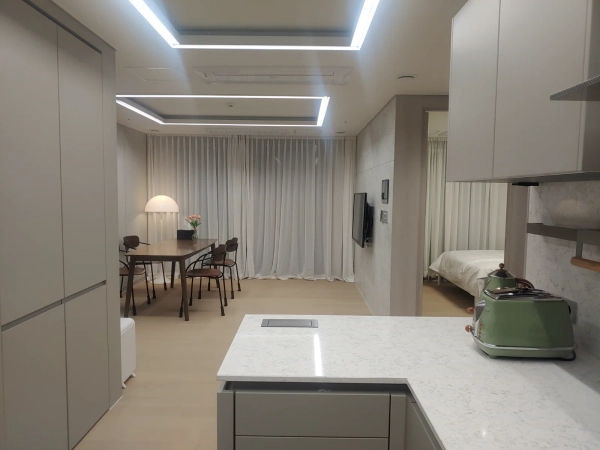 최근 마곡나루역 인근에서 가장 주목받는 3룸 신축 하이엔드급 오피스텔입니다. 지하철 5호선 마곡역과 지하철 9호선 급행역 마곡나루역 사이에 있어 대한민국 어디든 빠르게 이동 가능한 숙소입니다. 반려동물 입실 불가합니다. 실내 흡연 (전자담배포함) 금지입니다. 꼭지켜주세요.위반시 특수청소비용 청구합니다. 일별 추가 연장은 가능합니다 (문의 주세요) 숙박시설아닌 단기임대 시설로 침구와 세면용품과 수건등의 위생용품은 제공되지 않습니다. 침구는 대여 문의주세요 5명 넘는 추가 인원은 호스트에게 문의 하세요. 주변 편의시설: 슬세권(슬리퍼 생활권)의 끝판왕 마곡 MICE 복합단지 내에 위치해 있어 단지 안팎에서 모든 것을 해결할 수 있습니다. 대규모 쇼핑몰과 문화시설이 하부에 들어서 있어 멀리 나갈 필요가 없습니다. 이마트 트레이더스와 홈플러스, NC백화점 등이 가깝습니다. LG아트센터 서울: 세계적인 건축가 안도 다다오가 설계한 공연장이 도보 거리에 있어 수준 높은 문화생활이 가능합니다. 자연환경 (보타닉 공원): * 서울 최대 규모의 식물원인 **서울식물원(마곡중앙공원)**이 바로 인접해 있습니다. 여의도 공원의 2배 크기로, 산책이나 조깅을 즐기기에 더할 나위 없는 환경입니다. 의료 시설: 이대서울병원이라는 대형 종합병원이 인근에 있어 응급 상황이나 전문적인 의료 서비스 이용이 편리합니다. 가장 큰 장점은 단지 지하를 통해 주요 지하철역으로 바로 연결되는 직통 연결 시스템입니다. 지하철 노선: * 9호선 & 공항철도 (마곡나루역): 단지 지하 2층 통로를 통해 직접 연결됩니다. 급행 열차 이용 시 강남(신논현)까지 약 30분대, 서울역까지 약 15분대 이동이 가능합니다. 5호선 (마곡역): 역시 지하 통로로 연결되어 있어 비가 오나 눈이 오나 편리하게 이동할 수 있습니다. 여의도 15분, 광화문 30분으로 접근성이 매우 좋습니다. 도로망: 공항대로, 올림픽대로, 강변북로 진입이 수월하며, 김포공항(차량 10분)과 인천공항(차량 30~40분) 접근성이 뛰어나 해외 출장이 잦은 분들에게 최적입니다.