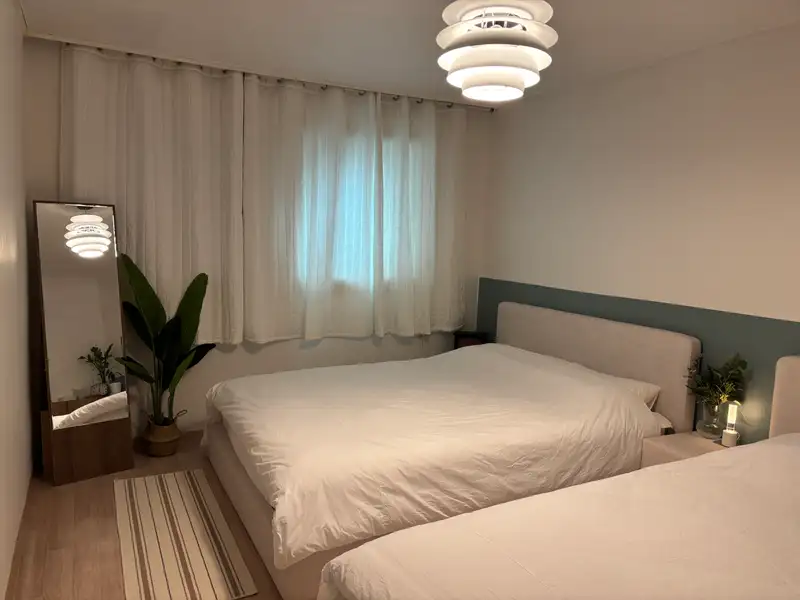 [교통] - 강동역 도보 6분, 천호역 도보 10분 - 공항버스(6200번)정류장 도보 7분 [주변 관광지 및 시설] - 올림픽공원(북2문) : 도보 20분 이내 - 공연장(KSPO DOME) : 택시 10분 - JYP 엔터테인먼트 사옥 : 도보 15분 이내 - 잠실 롯데월드, 롯데타워 : 택시 및 대중교통 15분 - 현대백화점, 이마트 : 도보 10분~15분 이내 - 아산병원, 강동성심병원 등 종합병원 : 3km이내 - 강풀만화거리, 성내전통시장 : 도보 2분 이내 [편의시설] - 편의점, 전통시장 도보 2분 - 공영주차장 도보 1분 [집 전체 사용] * 방 2개, 침대 3개, 욕실 1개, 주방 겸 거실 1개 [침실1] * 퀸 침대1, 3인용 소파(어린이 침대로 사용 가능) * 무료 Wifi * 스마트 TV(OTT제공-개인ID이용가능) * 블루투스 스피커, 책장, 스툴, 행거, 전신거울, 도서, 휴대전화 충전기(안드로이드/아이폰 가능) 등의 소품 [침실2] * 퀸 침대2 * 무료 Wifi * 스마트 TV(OTT제공-개인ID이용가능) * (게스트가 필요에 따라 이동식 TV 한 대를 자유롭게 이동하며 사용할 수 있습니다.) * 블루투스 스피커, 수납장, 전신거울, 스툴, 건조대(행거 겸용), 휴대전화 충전기(안드로이드/아이폰 가능) 등의 소품 [주방 및 식사공간/거실] * 6인용 식탁, 냉장고, 1구 인덕션, 전자레인지, 전기포트 * 6인용 식기 세트, 냄비, 프라이팬 등 조리도구와 커트러리, 일회용품 등의 조리 소품 [욕실] * 세탁기, 헤어드라이어 * 샴푸, 컨디셔너, 바디워시, 핸드워시 * 타올 등 욕실 소품 [주차] * 도보 1분 거리 공영주차장 이용 가능(150원/5분)