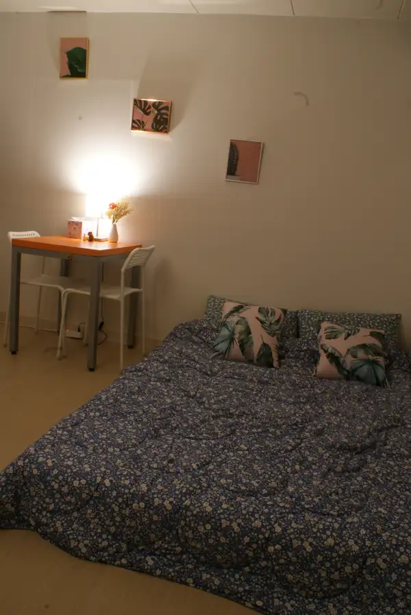 可以步行到建国大学。 距离首尔地铁2号线九宜站500米,步行5分钟左右,交通便利。 蚕室、建大、圣水、江边公共交通可在10分钟内移动,甚至徒步移动。 空间在4~5坪左右,是单独使用的独立空间,适合2个人一起生活。 建筑也竣工5~6年,达到新建水平,干净整洁,空间外部和内部都很干净。 空调和地板暖气都很好,夏天和冬天不用太担心。 厨房设施也准备好了。 ✅ 入室 16:00,退室 11:00 ✅入住的话,当天会介绍非面对面自助入住方式、门锁密码及详细事项。 ✅ 使用人员以2人为标准 ✅房间内所有床上用品、垫子等物品破损、污染、损坏时需追加费用。 ✅水、电、气等管理费是含有的价格。 过度使用时需要额外收费。 (外出时请关闭空调、暖气、电等。) ❌ 室内禁止吸烟。 ❌ 不能携带宠物。 <周边小吃,超市> 离家1分钟路程就有九宜站小吃街。 从九宜站1号出口开始的小吃街一直排到宿舍,餐厅、咖啡厅等外出就餐也非常好。 宿舍周围有很多超市,紫阳传统市场也可以徒步移动,可以购买食材的地方也足够了。 ✅距离地铁2号线1号出口500米,步行5分钟以内。 ✅宿舍前面还有公交车站,乘坐公共交通真是太棒了。