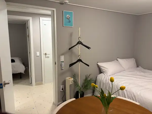 地面上铺有瓷砖,显得温馨美丽 欢迎大家来到重新装修的[汉江边感性宿舍] 本楼是2层建筑,位于2层。 晚上可以在安静安全的氛围中休息 在市中心也能感受到汉江的悠闲空间 [首尔主要旅游景点交通篇] - 步行三分钟 汉江纛岛出入口 - 公共交通十分钟路程 圣水,建大入口,紫阳市场,建大医院,首尔林 -公共交通二十分钟以内 蚕室乐天世界、KSPO DOME、蚕室棒球场、峨嵯山(龙马山) 峨山医院江南清潭洞高速客运站新堂洞炒年糕街 -公共交通半小时车程 东大门,钟路,明洞,首尔站 [便利设施] -便利店/超市:徒步1分钟 -洗衣房:徒步2分钟 [交通工具] -地铁2号线九宜站步行15分钟 -地铁7号线紫阳站步行15分钟 -机场巴士:步行 20 分钟 -公交车站:步行1分钟 >请一定要关掉暖气,然后退房。 >请把垃圾收集到垃圾桶里处理。 >在零下天气,为了防止冻裂,请打开水柱,使水柱掉落(厨房/卫生间淋浴间中间温度)。 无需额外支付烘干机、洗衣机费用即可使用。 调味料厨房用具没有碗 要亲自拿过来 在没有电梯的2层建筑中,位于2楼。 可以吃外卖! 入校时请务必手持行李箱安静移动(请为邻居着想) 没有电梯的2层楼的2层 • 法定地址:首尔广津区紫阳洞640-24 • 道路名地址:纛岛路52라街12-5 • 附近地标:紫阳汉江图书馆 • 寻路软件:NAVER地图/KAKAO地图最准确 • 公共交通:地铁 2 号线紫阳站 → 乘坐公交车/出租车出行 九宜站来的方法 "从九宜站出来后,从4号出口出来最方便。 从出口出来后,往纛岛游乐园方向坐公交车或打车,5分钟左右就到了。 在导航地图上输入***'纛岛路52路12-5'**,就可以直接指路。 从九宜站步行大约需要15~20分钟。" 从江边站来的方法 "从江边站1号出口出来,向techno mart方向移动后,再离开江边站。 坐去紫阳洞方向的乡村巴士或普通巴士,大概5~7分钟就能到。 打车可以开得更快, 在地图应用软件中输入**'纛岛路52路12-5'**,就能正确引导。" 来自紫阳站的方法 "在紫阳站从3号出口出来最近。 从出口出来,往紫阳汉江图书馆方向走就行,步行10分钟左右。 走着去有点尴尬的话,坐公交车或出租车3~4分钟就到了。 在地图应用软件中搜索**'纛岛路52路12-5'**,就能最准确地找到提示。"
