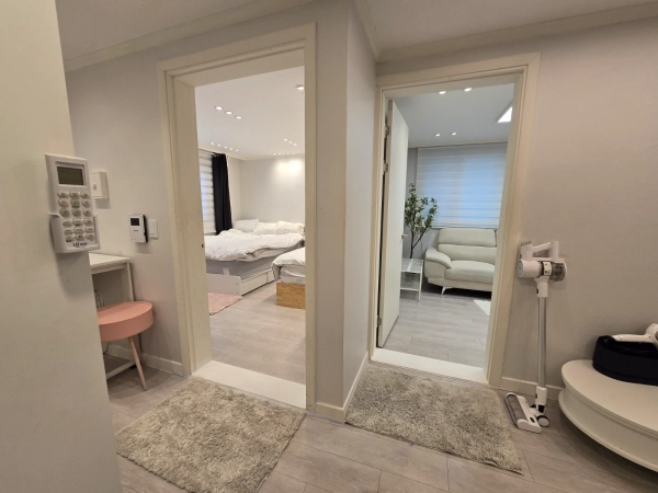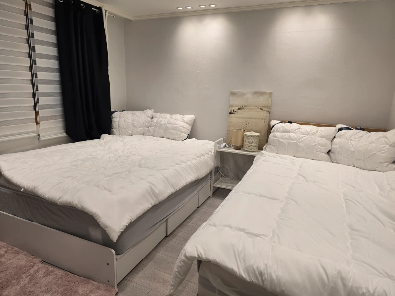 两卧室舒适房间 宽敞的主卧室,配备一张双人床和一张超单人床。 配备有60英寸电视(净柔性)、冰箱、微波炉、洗衣机和烘干机。 位于四楼朝南的房间采光充足,配备了一个大型私人阳台,非常适合放松。 - 短期住宿欢迎 非常适合国际宾客 - 距新沙和非贤地铁站步行5–6分钟 一个干净、温馨且方便的住宿地点,位于首尔最受欢迎的社区之一。 我们恳请客人将可回收物品分开存放。 请体谅邻居,避免噪音过大。 不幸的是,没有电梯。 但对健康有益 距辛萨站仅6分钟步行路程 步行仅需4分钟即可到达非贤站 距加罗苏吉步行15分钟内 步行约20分钟即可到达江南站
